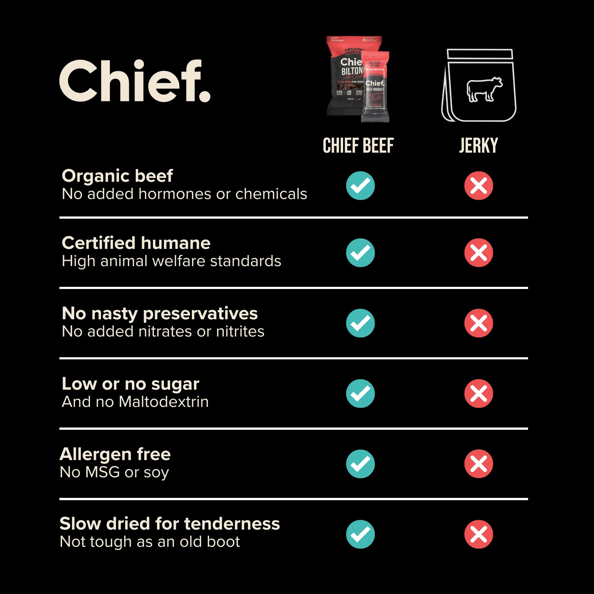 Unlike most jerky, we naturally preserve our beef bars just as our ancestors did - without nasty preservatives which destroy gut health. A lot of jerky is also surprisingly high in sugar, but not these bars, and they're slow dried which makes them much more tender than jerky. Better is an understatement.