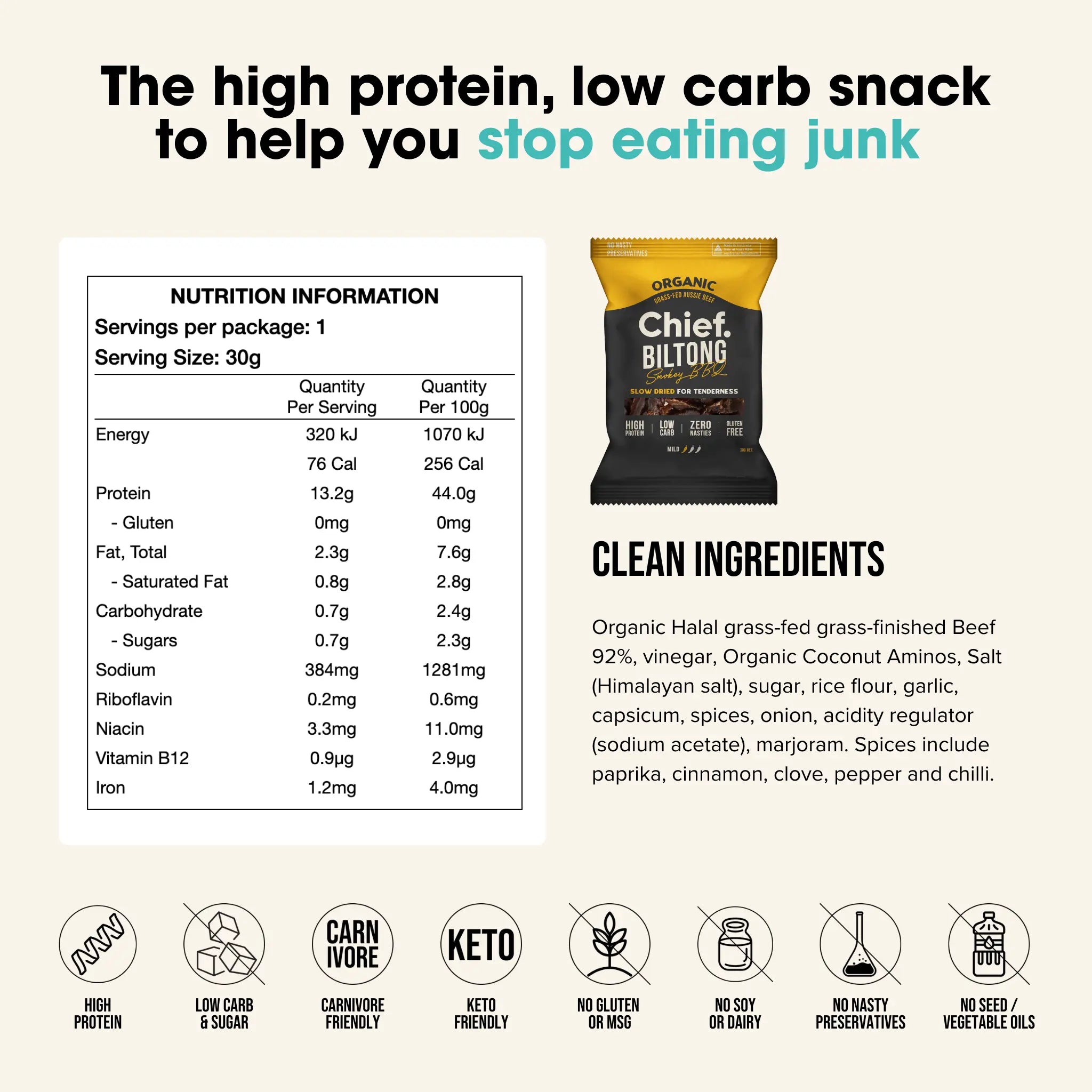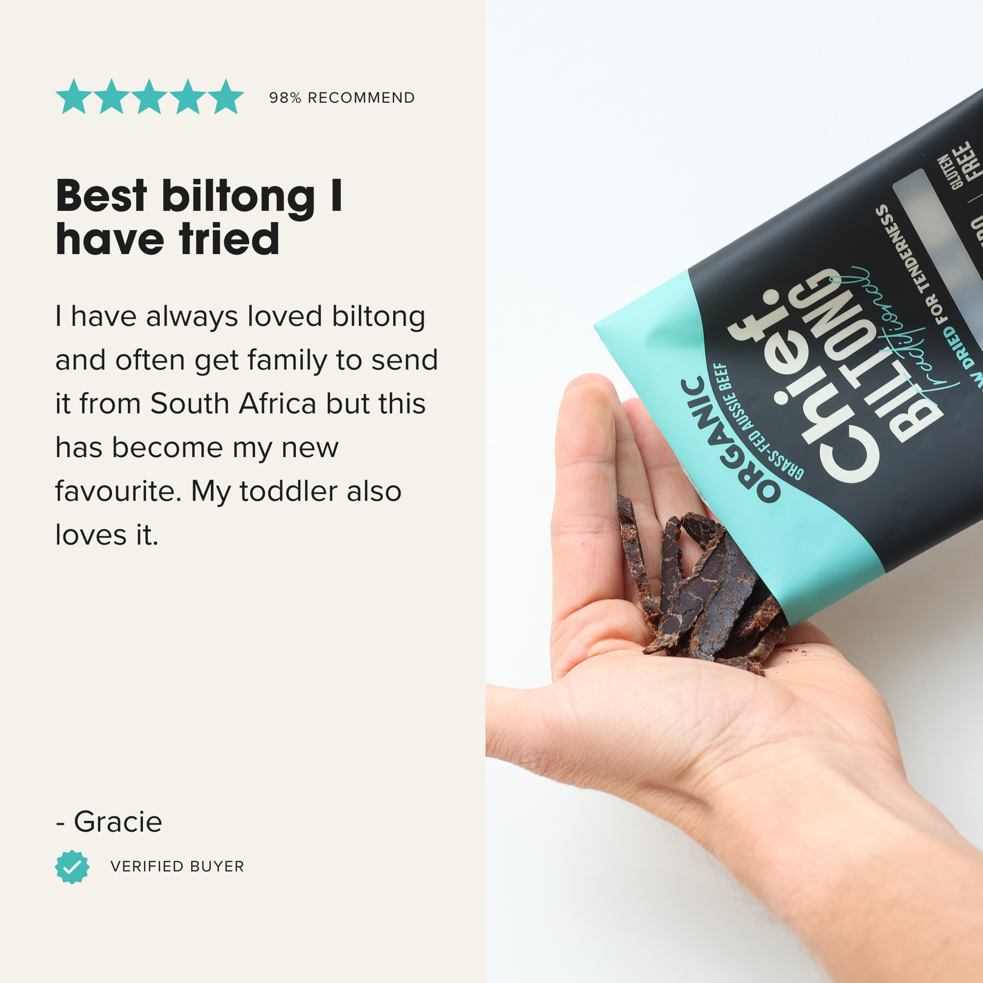 Our beef bars and biltong is slow dried which makes it tender, easy to chew, and easy to digest.